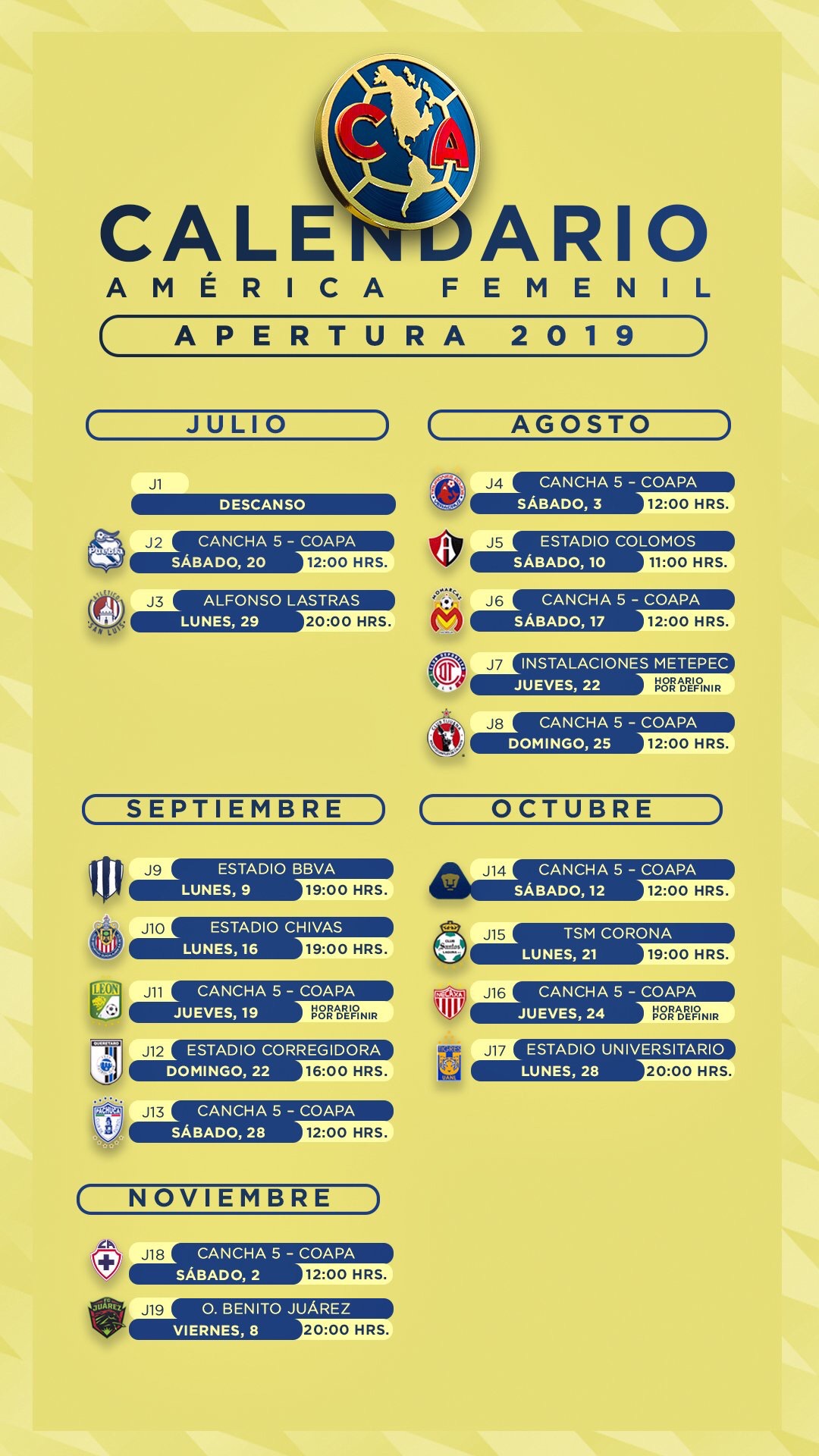 Las águilas femeniles jugarán por primera vez contra: Atlas, Morelia, Monterrey, Querétaro, Santos, Necaxa, Atlético San Luis y Juárez, estos últimos dos equipos que vienen del ascenso, todos estos son equipos que formaban parte del otro grupo.